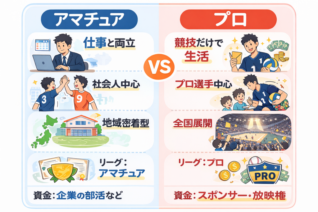 アマチュア選手→日中は本業の仕事、終わってからバレーボールの練習をする社会人選手